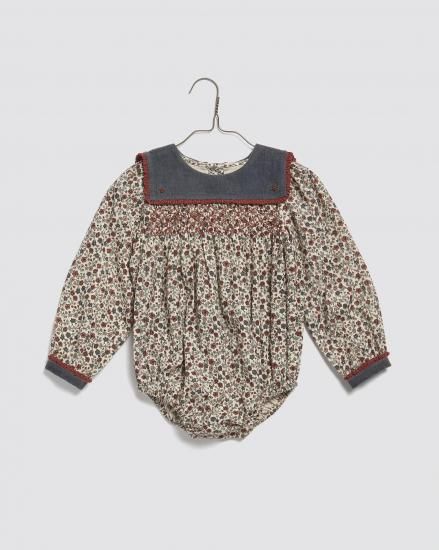 手刺繍のバラをあしらったベルベットセーラーカラーがポイントのロンパース。
